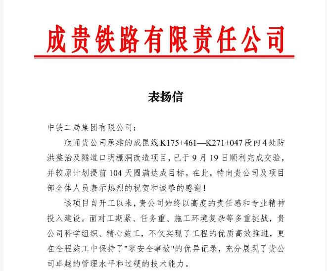 喜获双赞!成昆铁路防洪整治项目提前百日完工获业主连续表扬