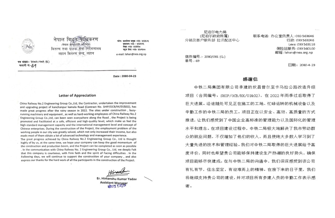 来信指出,项目部正以高标准的管理能力以及国际化的管理水平和理念,安全、高效、高质量地推进项目建设。项目在建设过程中,为当地群众带去了先进的技术和管理经验,极大地解决了当地的就业问题。拉汉市电力局表示,将在电力系统内部对项目部进行宣传和学习,让更多尼泊尔人了解KK公路项目和中铁二局,为项目建设工作提供支持。